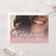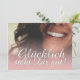 ¡Glücklich steht Dir gut! Kompliment Karte mit lachendem Frauengesicht und handschriftlichen Grüßen auf der Vorderseite der Karte. Restliche Flächen stehen zur freien Verfügung.