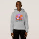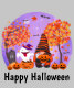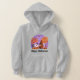 Una capucha de Halloween con un gnomo, fantasma, calabazas y árboles caídos con una luna morada en el fondo. El texto en el capucha es personalizable.