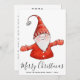 Esta tarjeta de Navidad única de vacaciones incluye un lindo ilustracion rojo gnome, saludos navideños de Feliz y un texto de plantilla para escribir el nombre de tu familia y el año. El calendario 2025 está al revés en un fondo blanco.