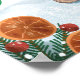 Se despliega una escena de hígge, con un festivo jultomten adornado con una gorra de cuchillos verde, un suéter rojo acogedor y pequeñas botas marrones, saboreando un tazón humeante de avena en un día nevado. Deliciosos grupos de naranjas secos, pinos y bayas forman una frontera vibrante. Ilustracion original de Noël Snow