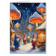Gnomes en una escena de bosques con nevados de setas que celebran con alegría de las vacaciones y comunidad con una pequeña cabaña de ambiente cálido y agradable y deliciosas bayas y frutas de las fiestas. En el interior se lee "¡Saludos de temporada!"