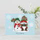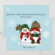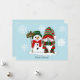 Un gnomo de Navidad lindo todo en rojo, verde y blanco que sostiene una taza de chocolate caliente está de pie junto a un muñeco de nieve con un letrero de Felices Fiestas junto a ellos que lleva una bufanda roja y un sombrero verde oscuro
