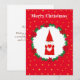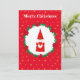 Gnomo de Navidad lindo, corona de pino, poinsettias, bolas y estrellas doradas en tarjeta de saludo de Navidad roja. Todo el texto listo para ser personalizado.