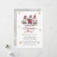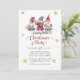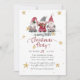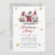 "Gnomos Rojos Aman Alegría Paz Reno Feliz Navidad Tarjeta de Fiesta." Ilustración de acuarela de un trío de gnomos con tipografía "Amor, Alegría, Paz", y estrellas doradas y copos de nieve te invitan a una Pequeña Fiesta de Navidad Alegre. Un par de renos y otro gnomo están en el reverso junto con un fondo gris suave con patrón de copos de nieve. Arte de Audrey Jeanne Roberts, derechos de autor.
