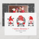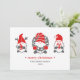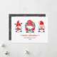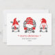 Tres gnomo divertidos de la tradición popular nórdica adornan estas lindas tarjetas navideñas y festivas en tonos rojos y grises sobre un fondo rosa suave.