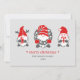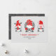 Tres divertidos gnomos de la tradición popular nórdica adornan estas lindas tarjetas navideñas y festivas en tonos rojos y grises sobre un fondo rosa suave.