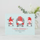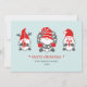 Tres gnomo divertidos de la tradición popular nórdica adornan estas lindas tarjetas navideñas y festivas en tonos rojos y grises sobre un fondo rosa suave.