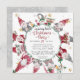 "Gnomos Lindos Rojo Gris Tarjeta de Fiesta de Navidad." Ilustración de acuarela de un círculo de gnomos con texto como: Paz, Amor, Alegría, Me Encantan los Gnomos y más. El fondo tiene estrellas doradas dispersas y copos de nieve que te invitan a una Fiesta de Navidad Alegre. El reverso tiene un fondo gris suave con un patrón de copos de nieve que caen. Arte de Audrey Jeanne Roberts, derechos de autor.