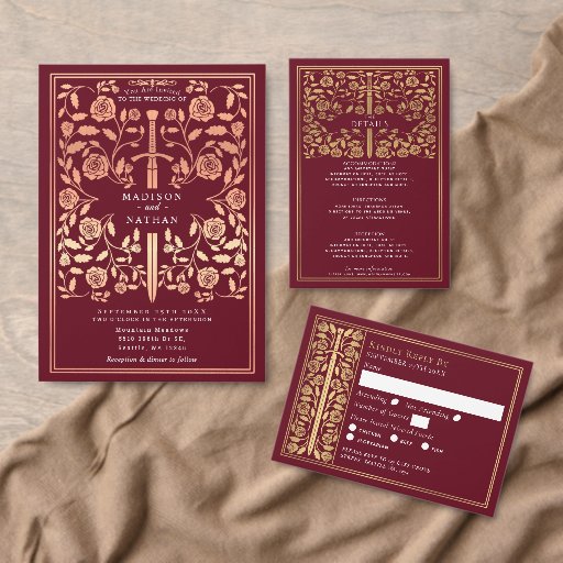 Gold Red Medieval Floral Sword Wedding RSVP
