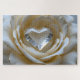 Golden-Edged Purity brings calmness, elegance, and soft luxury to a beautiful puzzle featuring an ivory rose with golden-edged petals and a radiant heart-shaped clear quartz crystal at its center. The horizontal composition creates a soothing flow, making each piece feel satisfying and visually rewarding.