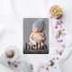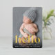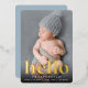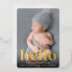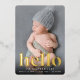 Las nuevas y modernas tarjetas de presentación de natalidad incluyen una foto vertical o retrato de sangrado completo con "hola" colocado en la parte inferior con letras de Relieve metalizado dorado. Personalice el nombre y las estadísticas de nacimiento del bebé y añada una foto adicional en la parte posterior, junto con un mensaje personal.
