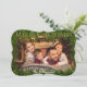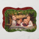 Una atractiva y atractiva tarjeta de Navidades con la foto de tu familia resaltada por un marco de ramas de árboles de Navidad. Dorado espumoso Feliz Navidad a lo largo de la parte superior y tus nombres cerca del fondo. En la parte trasera hay un patrón repetido de la dorada Feliz Navidad contra un rojo oscuro.