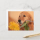 ¡Aquí hay una flor para ti! Esta postal muestra una fotografía de un lindo perro recuperador de oro sosteniendo una flor amarilla en su boca. La tarjeta es totalmente personalizable. Agregue texto al frente y, si lo desea, al revés. Incluso puede mover o quitar el marcador de posición del sello y la línea divisoria vertical.