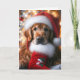 Un golden retriever que lleva un sombrero de Santa se posa frente a un árbol de Navidad decorado con luces brillantes con una media en la boca
