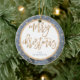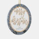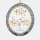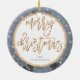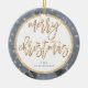 Ornamento navideño con efecto dorado (faux, impreso como imagen) estrellas, Feliz Navidad y texto azul personalizable, donde puedes añadir tu apellido. Es un ornamento cerámico de doble cara y mide 2.87 pulgadas por 2.87 pulgadas y pesa 1.4 onzas.