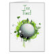 Ilustracion moderno con el golf como tema. Una bola de golf representa la Tierra con golfistas y banderas a su alrededor en tonos verdes. Diseño divertido y moderno para los amantes del golf.