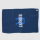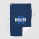 Toalla de golf moderna para él con un monograma azul y un nombre blanco sobre un fondo azul oscuro. Personaliza con el nombre y la inicial.