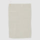 Primer plano de una toalla estampada con un pequeño motivo geométrico de diamante en azul verde y naranja sobre un fondo blanco. Un anillo metálico está unido en la esquina superior.
