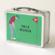 Golfer, con gorra, camisa roja y pantalones azules, poniendo una pelota de golf en una lonchera de hoyos. Personalizar el texto.