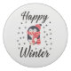 Ilustracion pingüino, copos de nieve y texto: Feliz invierno.