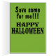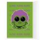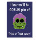 La goblin sonriente Adorable tiene piel verde, pelo morado funky, colmillos y grandes ojos dulces. Portada: Cara de goblin con texto: oigo que serás GOBLIN de golosinas de Trick o Treat. Cubierta frontal interior: goblin face over nom nom nom patrón fondo. Mensaje interno: ¡¡¡Salven algo para mí!!! ¡Feliz Halloween! ¡Esta es una tarjeta de diversión para tus roneadores favoritos de Halloween!