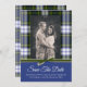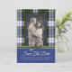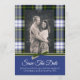 Boda fotográfica personalizado ahorra la tarjeta de fecha hecha en una tarjeta plana con gráficos del clásico patrón tartán del clan escocés Gordon Dress. La parte inferior del frente de la tarjeta está hecha en azul sólido con gráficos de una cinta verde, en la parte superior. Personalice la imagen y el texto de su compromiso para que se ajusten a sus necesidades. Se ofrecen productos de boda de vestidos de Gordon.