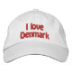 Amo a Dinamarca. ¡Muéstrate tu orgullo danés con este gorra bordado personalizado! La bandera nacional de Dinamarca, Dannebrog, es roja con una cruz escandinava blanca que se extiende hasta los bordes de la bandera.