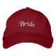 El gorro de novia se muestra en rojo con un texto bordado en blanco. Personalizar este artículo o compra tal cual.