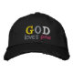¡Esta es una bonita gorra de béisbol de color negro 'angustiada' que dice 'DIOS te ama' en coloridas letras bordadas! ¡Hará una idea de regalo para un cristiano!