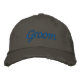 Hilos bordados personalizados del distrito, gorra de béisbol de tweed chino desgastado en color gris níquel con tipografía de texto "Groom" en azul real y diseño gráfico digital de TheFabricSeal, tienda bajo demanda en Zazzle.com #ZazzleMade https://www.zazzle.com/store/thefabricseal TheFabricSeal Original.