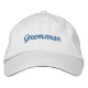 Gorras de béisbol ajustables básicas de ropa alternativa bordadas a mano en blanco con tipografía de texto "Groomsman" en azul marino y diseño gráfico digital de TheFabricSeal impreso bajo demanda en la tienda Zazzle.com #ZazzleMade https://www.zazzle.com/store/thefabricseal TheFabricSeal©️Original.
