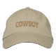 Texto marrón de "Cowboy". Disponible en una variedad de colores y estilos de gorras.