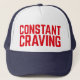 Diversión QUE ANHELA CONSTANTE y lema irónico en el gorra del camionero, rojo, declaración tipográfica divertida, inspirada por rossitano de la carta franca del carácter de la comedia de la TV. cravings constantes y perpetuos.