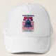 Este camionero patriótico presenta un ilustracion moderno de la campana de la libertad con colores rojo, blanco y azul y estrellas de color dorado con fondo rayado. El texto dice: 1776, Liberty Bell, 2026, Filadelfia, Pennsylvania. Excelente como recuerdo o regalo.