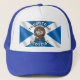 El sombrero de camionero de arriba muestra la insignia del clan Agnew con sash tartán y fondo de la bandera escocesa. Viste a los juegos de las tierras altas, festivales celtas, reuniones familiares o en los alrededores de la ciudad. ¡Muéstrenles a todos quiénes sois! Como el gorra dice "¡Orgulloso de ser escocés"!