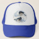 Este gorra se adorna con dos arrendajos azules coloridos que rasguñan en la nieve para que algo coma. Las sombras azules forman un modelo precioso en el fondo.