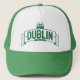 Características del diseño Dublín, Irlanda en un sistema de banderas curvadas, rematado con tréboles, una arpa y los laureles. Se apena el diseño.