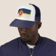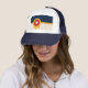Sombrero camionero con un diseño con la bandera de Tulsa, Oklahoma. Bandera beige y azul marino con un escudo Osage dorado que contiene un círculo rojo y una estrella beige de seis puntas