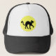 Esta gorra de bola tiene un gato negro con la espalda arqueada y los ojos verdes frente a una gran luna amarilla llena de luz.