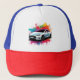 Un auto eléctrico moderno ilustrado digitalmente contra un vibrante salpicón de pintura multicolor, que combina innovación y arte.