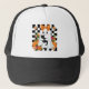 This super cute Halloween trucker hat features an adorable ghost wearing a large orange bow and happily hugging a little black cat. Surrounded by bright orange pumpkins, retro daisies, and colorful fall flowers, this artwork captures a unique blend of spooky charm and vintage floral aesthetics.