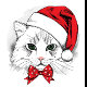 Ilustracion de un gato blanco vestido con un sombrero de Papá Noel rojo y corbata de arco rojo con puntos de polka blancos, el gato tiene ojos verdes y una nariz rosa, el estilo es un sketch de blanco y negro con acentos rojos, el fondo es blanco.