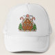 Fun festive holiday hat with a gingerbread house, designed with candy canes and Christmas trees. Great for gifting friends or family for the holidays.
