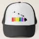 The name of the state of Hawaii in colors of the rainbow, along with the shape of the islands.