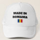 "Hecho en Rumania" con letras negras y bandera rumana con sombrero de camionero blanco.