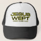 Este camionero muestra un diseño que presenta las palabras "Jesus Wept" con la escritura biblia del Rey James John 11:35 en una letra en negrita con letras amarillas y negras con contorno amarillo y negro más citación de la biblia debajo de este tema bíblico basado en la fe. Este gorra es cómodo, casual y ajustable de 17 a 24" con un frente de espuma de nylon al 100% y malla de nylon de vuelta excelente para el uso diario o cualquier ocasión especial.