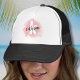 Un fondo de acuarela de color rosa suave proporciona el lienzo para un monograma contemporáneo y lindo, que presenta iniciales y nombre. La paleta de colores en negro y blanco del monograma, compuesta por fuentes modernas limpias mezcladas con una fuente de escritura, emana un encanto simple pero divertido. Ya sea que desees usar tu primer nombre o apellido, ¡la decisión es tuya! Puedes encontrar que tu inicial se siente más baja o más alta de lo que debería una vez que cambies las letras. Si ingresas a la herramienta de edición, puedes moverlos fácilmente. Regalo de gorra de camionero personalizada con monograma y nombre en acuarela rosa para ella.