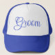 Gorras de béisbol de camionero personalizadas en color azul real y blanco con la letra "Groom" en tipografía de texto azul real y diseño gráfico digital de TheFabricSeal en tienda de impresión bajo demanda en Zazzle.com #ZazzleMade https://www.zazzle.com/store/thefabricseal TheFabricSeal Original.