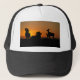 Una pequeña manada de ovejas de rencor se asienta para la noche. Sus siluetas se oponen a la puesta de sol que se enciende detrás de ellas. Arte por computadora de Kathie Miller.