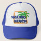 Marco anaranjado del arte alrededor de la palmera verde, texto azul intrépido de la playa de Malibu, un diseño inusual que es una original verdadera no encontrada en alamedas o paseos marítimos. ¡Forma de vida de California meridional en un gorra/un casquillo elegantes y prácticos! Playa de Malibu en el texto azul profundo del océano, palmera verde herbosa detrás del marco artístico contemporáneo anaranjado de la sol. ¡Otra original de las camisetas de Malibu!